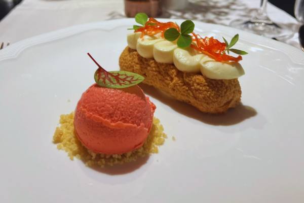 Roasted vegetable consommé / millet and vegetable dumpling / lovage oil