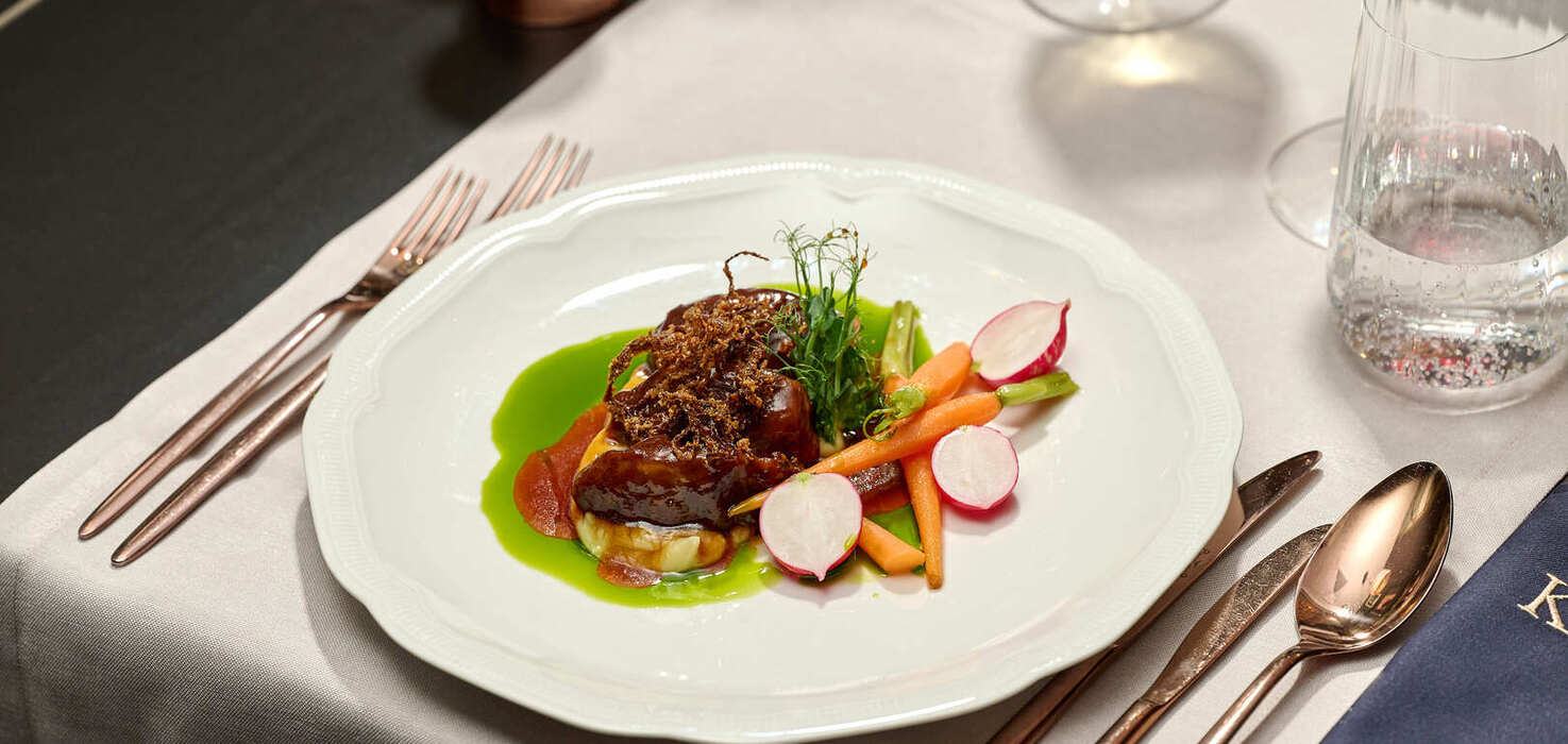Policzek wieprzowy długo duszony w sosie jałowcowym / puree z pasternaku / młoda marchew glazurowana miodem gryczanym / kiszona rzodkiew